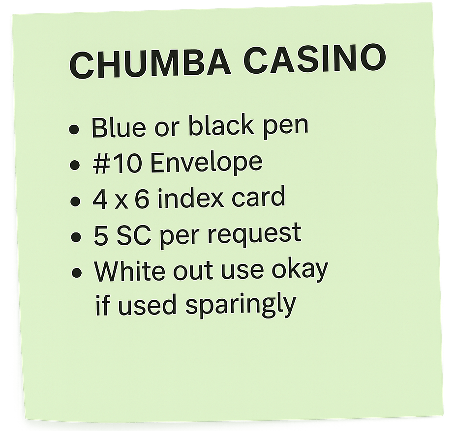 Did you know you can enter Chumba Casino’s sweepstakes without spending a dime? Thanks to the Alternate Method of Entry (AMOE), you can mail in a request and receive free Sweeps Coins — no purchase necessary. To make it easy, I’ve put together ready-to-use templates for both the envelope and the 4×6 index card.