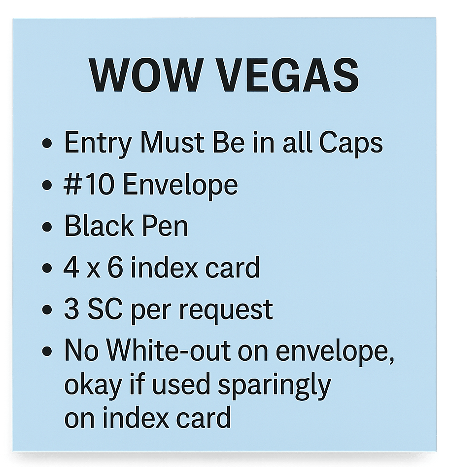 Now for the βpiece that completes the kitβ: the blank 4Γ6 index card. WOW Vegas requires your details and a short request statement. Using the index card template makes this painless: